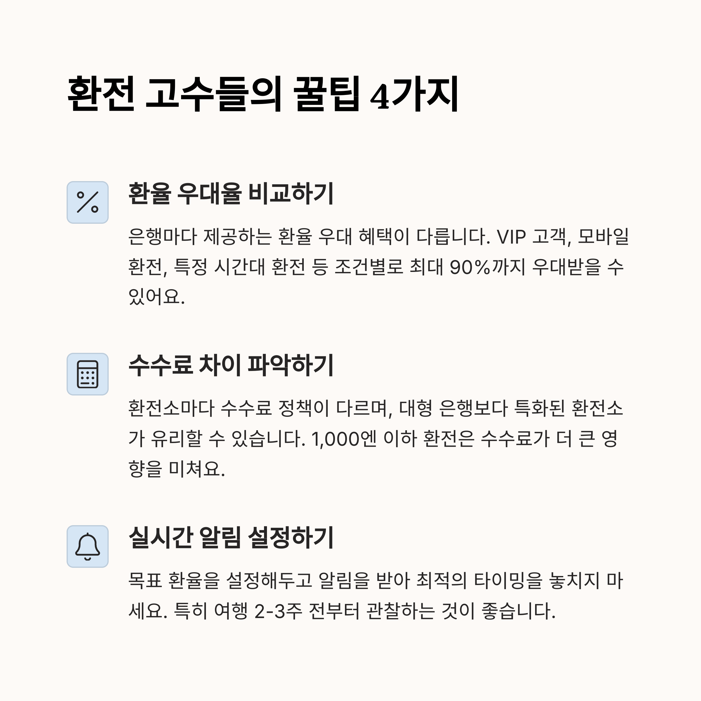 | 은행앱, 한국은행 사이트 등 다양한 경로 활용 | 수수료 포함 여부를 반드시 체크해야 정확 | 환율계산기, 실시간 알림 기능 적극 활용 |