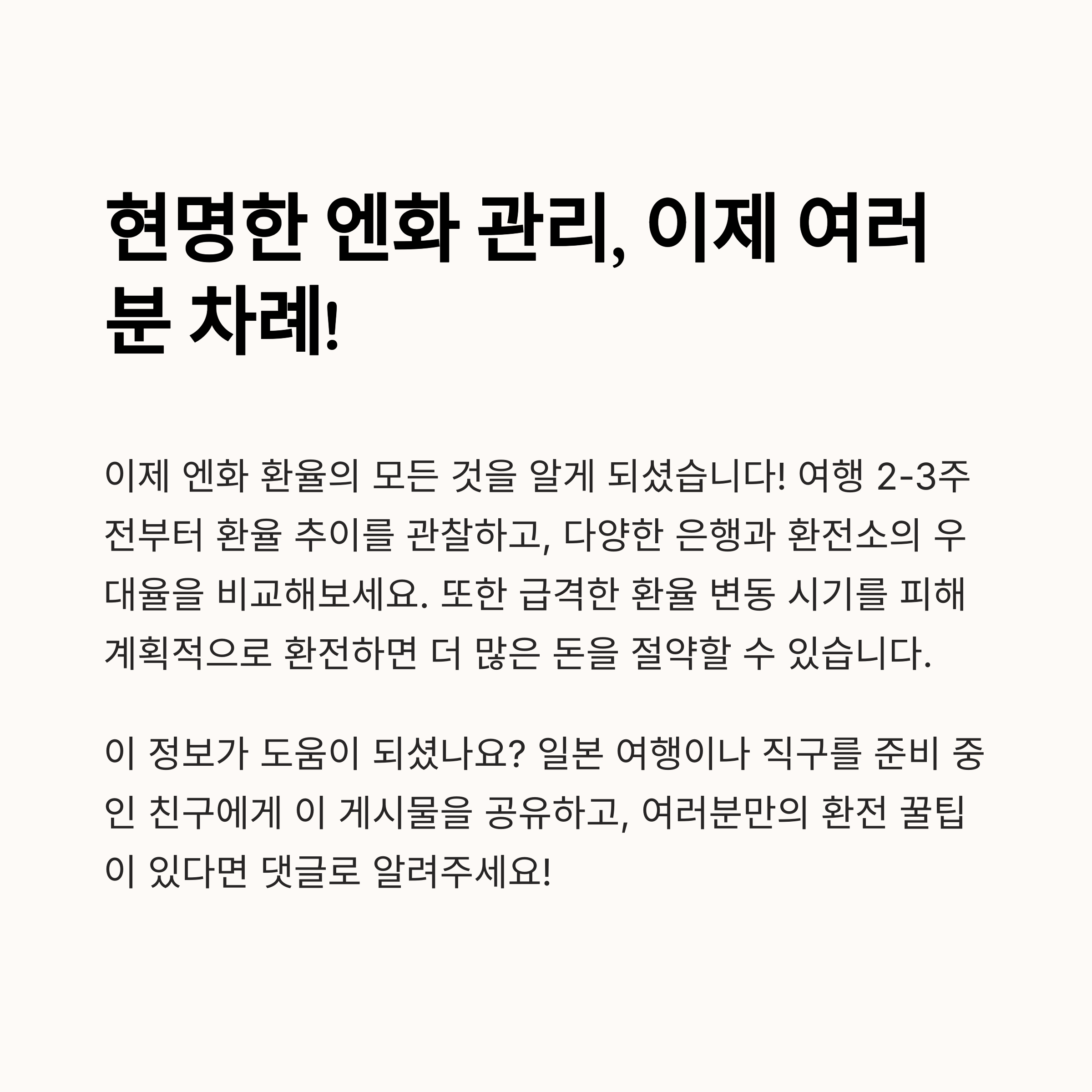 엔화 환율을 확인할 때 자주 사용하는 사이트나 앱이 있으신가요? 혹은 더 좋은 팁이나 궁금한 점이 있다면 댓글로 자유롭게 공유해 주세요. 여러분의 경험과 의견이 다른 분들께도 큰 도움이 됩니다!
